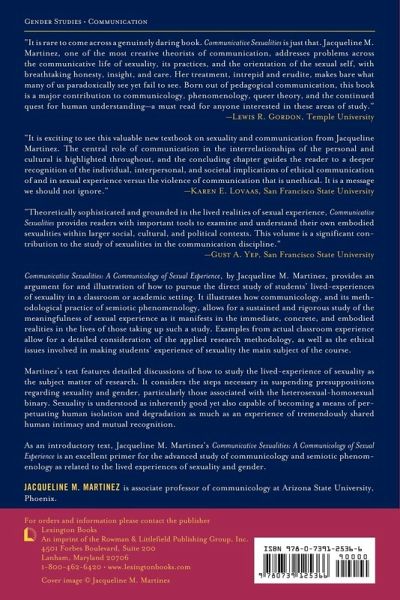 Communicative Sexualities: A Communicology of Sexual Experience, by Jacqueline M. Martinez, provides an argument for and illustration of how to pursue the direct study of students' lived-experiences of sexuality in a classroom or academic setting. It illustrates how communicology, and its methodological practice of semiotic phenomenology, allows for a sustained and rigorous study of the meaningfulness of sexual experience as it manifests in the immediate, concrete, and embodied realities in the lives of those taking up such a study. Examples from actual classroom experience allows for a detailed consideration of the applied research methodology, as well as the ethical issues involved in making students' experience of sexuality the main subject of the course. Martinez's text features detailed discussions of how to study the lived-experience of sexuality as the subject matter of research. It considers the steps necessary in suspending presuppositions regarding sexuality and gender, particularly those associated with the heterosexual-homosexual binary. Sexuality is understood as inherently good, yet also capable of becoming a means of perpetuating human isolation and degradation as much as an experience of tremendously shared human intimacy and mutual recognition. As an introductory text, Jacqueline M. Martinez's Communicative Sexualities: A Communicology of Sexual Experience is an excellent primer for the advanced study of communicology and semiotic phenomenology as related to the lived-experiences of sexuality and gender.