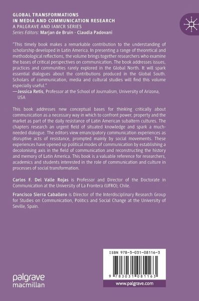 This book addresses new conceptual bases for thinking critically about communication as a necessary way in which to confront power, property and the market as part of the daily resistance of Latin American subaltern cultures. The chapters research an urgent field of situated knowledge and spark a much-needed dialogue. The editors view emancipatory communication experiences as disruptive acts of resistance, prompted mainly by social movements. These experiences have opened up political modes of communication by establishing a decolonising axis in the field of communication and reconstructing the history and memory of Latin America. This book is a valuable reference for researchers, academics and students interested in the role of communication and culture in processes of social transformation.