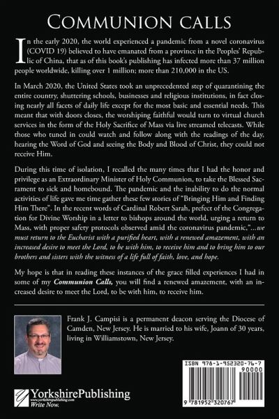 In the early 2020, the world experienced a pandemic from a novel coronavirus (COVID-19) believed to have emanated from a province in the Peoples' Republic of China, that as of this book's publishing has infected more than 37 million people worldwide, killing over 1 million; more than 210,000 in the US. In March 2020, the United States took an unprecedented step of quarantining the entire country, shuttering schools, businesses and religious institutions, in fact closing nearly all facets of daily life except for the most basic and essential needs. This meant that with doors closes, the worshiping faithful would turn to virtual church services in the form of the Holy Sacrifice of Mass via live streamed telecasts. While those who tuned in could watch and follow along with the readings of the day, hearing the Word of God and seeing the Body and Blood of Christ, they could not receive Him. During this time of isolation, I recalled the many times that I had the honor and privilege as an Extraordinary Minister of Holy Communion, to take the Blessed Sacrament to sick and homebound. The pandemic and the inability to do the normal activities of life gave me time gather these few stories of "Bringing Him and Finding Him There." In the recent words of Cardinal Robert Sarah, prefect of the Congregation for Divine Worship in a letter to bishops around the world, urging a return to Mass, with proper safety protocols observed amid the coronavirus pandemic. "we must return to the Eucharist with a purified heart, with a renewed amazement, with an increased desire to meet the Lord, to be with him, to receive him and to bring him to our brothers and sisters with the witness of a life full of faith, love and hope. My hope is that in reading these instances of grace filled experiences I had in some of my Communion Calls, you will find a renewed amazement, with an increased desire to meet the Lord, to be with him, to receive him.