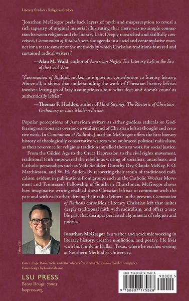 Popular perceptions of American writers as either godless radicals or God-fearing reactionaries overlook a vital tradition of Christian leftist thought and creative work. In Communion of Radicals, Jonathan McGregor offers the first literary history of theologically conservative writers who embraced political radicalism, as their reverence for tradition impelled them to work for social justice. Challenging recent accounts that examine twentieth-century American literature against the backdrop of the rising Religious Right, Communion of Radicals uncovers a different literary lineage in which allegiance to religious tradition fostered dedication to a more just future. From the Gilded Age to the Great Depression to the civil rights movement, traditional faith empowered the rebellious writing of socialists, anarchists, and Catholic personalists such as Vida Scudder, Dorothy Day, Claude McKay, F. O. Matthiessen, and W. H. Auden. By recovering their strain of traditioned radicalism, McGregor shows how strong faith in the past can fuel the struggle for an equitable future. As Christian socialists, Scudder and Ralph Adams Cram envisioned their movement for beloved community as a modern version of medieval monasticism. Day and the Catholic Workers followed the fourteenth-century example of St. Francis when they lived and wrote among the disaffected souls on the Bowery during the Great Depression. Tennessee's Fellowship of Southern Churchmen argued for a socialist and antiracist understanding of the notion of "the South and the Agrarian tradition" popularized by James McBride Dabbs, Walker Percy, and Wendell Berry. Agrarian roots flowered into creative expressions encompassing the queer and Black medievalist poetry of Auden and McKay, respectively; Matthiessen's Catholic socialist interpretation of the American Renaissance; and the genteel anarchism of Percy's southern comic novels. Imaginative writing enabled these Christian leftists to commune with the past and with each other, driving their radical efforts in the present. Communion of Radicals chronicles a literary Christian left that unites deeply traditional faith with radicalism, and offers a usable past that disrupts perceived alignments of religion and politics.