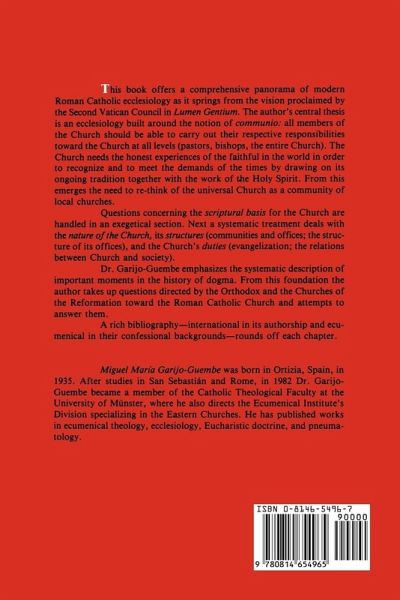 This book offers a comprehensive panorama of modern Roman Catholic ecclesiology as it springs from the vision proclaimed by the Second Vatican Council in Lumen Gentium. The author's central thesis is an ecclesiology built around the notion of communio: all members of the Church should be able to carry out their respective responsibilities toward the Church at all levels (pastors, bishops, the entire Church). The Church needs the honest experiences of the faithful in the world in order to recognize and to meet the demands of the times by drawing on its ongoing tradition together with the work of the Holy Spirit. From this emerges the need to re re-think of the universal Church as a community of local churches. Questions concerning the scriptural basis for the Church are handled in an exegetical section. Next a systematic treatment deals with the nature of the Church, its structures (communities and offices; the structure of its offices), and the Church's duties (evangelization; the relations between Church and society). Dr. Garijo-Guembe emphasizes the systematic description of important moments in the history of dogma. From this foundation the author takes up questions directed by the Orthodox and the Churches of Reformation toward the Roman Catholic Church and attempts to answer them.. A rich bibliography-international in its authorship and ecumenical in their confessional backgrounds-rounds off each chapter.