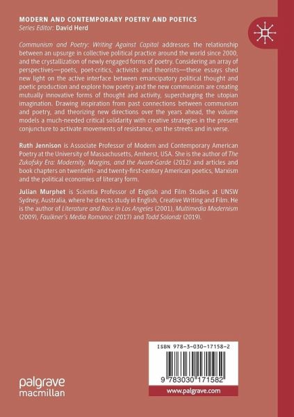 Communism and Poetry: Writing Against Capital addresses the relationship between an upsurge in collective political practice around the world since 2000, and the crystallization of newly engaged forms of poetry. Considering an array of perspectives-poets, poet-critics, activists and theorists-these essays shed new light on the active interface between emancipatory political thought and poetic production and explore how poetry and the new communism are creating mutually innovative forms of thought and activity, supercharging the utopian imagination. Drawing inspiration from past connections between communism and poetry, and theorizing new directions over the years ahead, the volume models a much-needed critical solidarity with creative strategies in the present conjuncture to activate movements of resistance, on the streets and in verse.