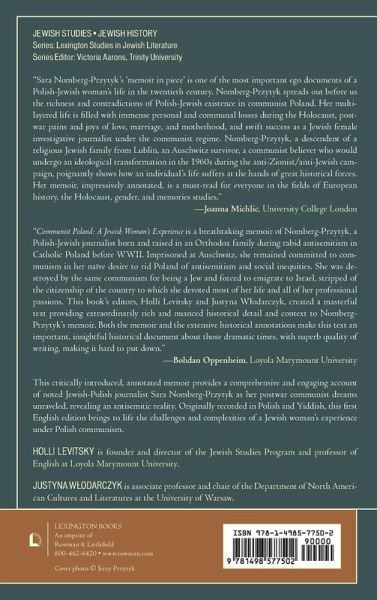 Communist Poland: A Jewish Woman's Experience is the first-person account by Jewish journalist Sara Nomberg-Przytyk of surviving Auschwitz then rising to various leadership roles in the newly-formed postwar Polish Communist Party. Building a just and equitable Poland for the common Pole through communism was her dream. The reality was neither simple nor successful. Working for heavily censored newspapers and periodicals, Nomberg-Przytyk witnessed firsthand the inner workings of a communist government plagued by the same Kafkaesque bureaucracy and antisemitism that she had been certain it would fix. Her memoir provides a comprehensive account as she slowly changed from enthusiastic practitioner to witness of a system that failed her and many others. This is the first published edition of this text, originally recorded as oral testimony in Polish but translated into English by Paula Parsky, and includes a critical introduction by the co-editors, American and Polish academics Holli Levitsky and Justyna Wlodarczyk, as well as extensive annotations.