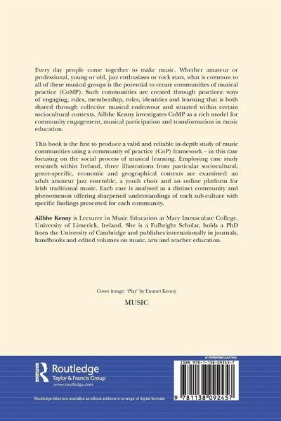Every day people come together to make music. Whether amateur or professional, young or old, jazz enthusiasts or rock stars, what is common to all of these musical groups is the potential to create communities of musical practice (CoMP). Such communities are created through practices: ways of engaging, rules, membership, roles, identities and learning that is both shared through collective musical endeavour and situated within certain sociocultural contexts. Ailbhe Kenny investigates CoMP as a rich model for community engagement, musical participation and transformation in music education. This book is the first to produce a valid and reliable in-depth study of music communities using a community of practice (CoP) framework - in this case focusing on the social process of musical learning. Employing case study research within Ireland, three illustrations from particular sociocultural, genre-specific, economic and geographical contexts are examined: an adult amateur jazz ensemble, a youth choir, and an online Irish traditional music web platform. Each case is analysed as a distinct community and phenomenon offering sharpened understandings of each sub-culture with specific findings presented for each community.