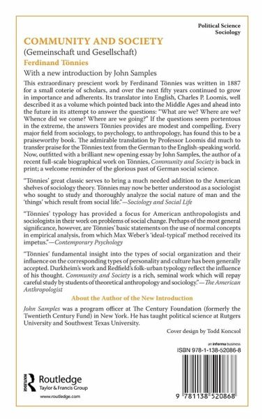 This extraordinary prescient work by Ferdinand Toennies was written in 1887 for a small coterie of scholars, and over the next fifty years continued to grow in importance and adherents. Its translator into English, Charles P. Loomis, well described it as a volume which pointed back into the Middle Ages and ahead into the future in its attempt to answer the questions: "What are we? Where are we? Whence did we come? Where are we going?" If the questions seem portentous in the extreme, the answers Toennies provides are modest and compelling.