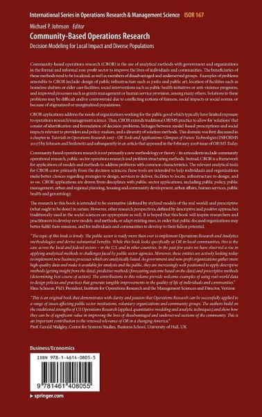 Community-based operations research (CBOR) is defined as the collection of analytical methods applied to problem domains in which interests of underrepresented, underserved, or vulnerable populations in localized jurisdictions, formal or informal, receive special emphasis, and for which solutions to problems of core concern for daily living must be identified and implemented so as to jointly optimize economic efficiency, social equity, and administrative burdens. This domain was first discussed in a chapter in Tutorials in Operations Research 2007 - OR Tools and Applications: Glimpses of Future Technologies (INFORMS 2007) by Johnson and Smilowitz and subsequently in an article that appeared in the February 2008 issue of OR/MS Today.