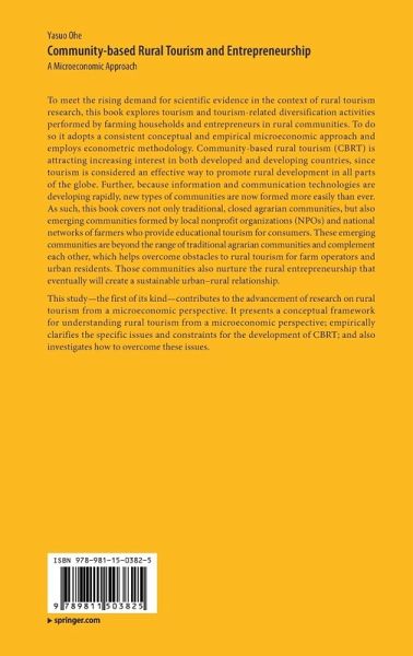 To meet the rising demand for scientific evidence in the context of rural tourism research, this book explores tourism and tourism-related diversification activities performed by farming households and entrepreneurs in rural communities. To do so it adopts a consistent conceptual and empirical microeconomic approach and employs econometric methodology. Community-based rural tourism (CBRT) is attracting increasing interest in both developed and developing countries, since tourism is considered an effective way to promote rural development in all parts of the globe. Further, because information and communication technologies are developing rapidly, new types of communities are now formed more easily than ever. As such, this book covers not only traditional, closed agrarian communities, but also emerging communities formed by local nonprofit organizations (NPOs) and national networks of farmers who provide educational tourism for consumers. These emerging communities are beyond the range of traditional agrarian communities and complement each other, which helps overcome obstacles to rural tourism for farm operators and urban residents. Those communities also nurture the rural entrepreneurship that eventually will create a sustainable urban-rural relationship.