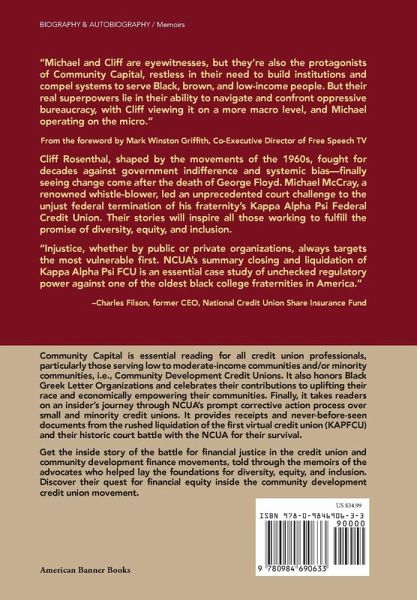 No margin-no mission... What does it take to bring financial justice to communities of color? Cliff Rosenthal, shaped by the movements of the 1960s, fought for decades against government indifference and systemic bias-finally seeing change come after the death of George Floyd. Michael McCray, a renowned whistle-blower, led an unprecedented court challenge to the unjust federal termination of his fraternity's Kappa Alpha Psi Federal Credit Union. Here for the first time you'll find the inside story of the landmark KAPFCU v NCUA federal court case. These stories will inspire all those working to fulfill the promise of diversity, equity, and inclusion in the financial system.