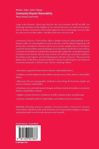 Disaster vulnerability is rapidly increasing on a global scale, particularly for those populations which are the historical clients of the social work profession. These populations include the very young and very old, the poor, ethnic and racial minorities, and those with physical or mental disabilities. Social workers are increasingly providing services in disasters during response and recovery periods, and are using community interventions to reduce disaster vulnerability. There is a need for a cogent theory of vulnerability and research that addresses improved community disaster practice and community resilience. Community Disaster Vulnerability and Resilience provides a unifying theoretical framework backed by research which can be translated into knowledge for effective practice in disasters.