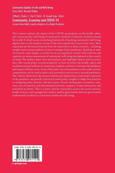 This volume explores the impact of the COVID-19 pandemic on the health, safety, and socioeconomic well-being of community residents of selected countries around the world. It is built on an overarching framework of studying community well-being, applied here to the analyses of one of the most significant crises of our time. Most important are the lessons learned from the experiences in these countries - including insights and recommendations on how to mitigate future pandemics. Building on years of research, each chapter is written by an accomplished scholar with interests and expertise on various assessments of community well-being development in the country of study. The authors share cases and analyses, and highlight failures and successes; they offer sound policy recommendations on how to restore the health, safety, and multidimensional wellness of community residents, and how to decrease the likelihood and impact of future crises. Some of the policy recommendations in this multi-country compendium can be used to assist crisis prevention and recovery, beyond pandemics. The volume shows how the lessons learned and shared from community responses to the pandemic can provide critical and useful policy insights to shape best practices in mitigating other disasters like hurricanes, floods, earthquakes, tornadoes, wars, riots, acts of domestic and international terrorism, weapons of mass destruction and industrial accidents. This is a must-read for researchers across the social sciences, health sciences, and management studies, and for government and non-government professionals involved in community health and well-being.