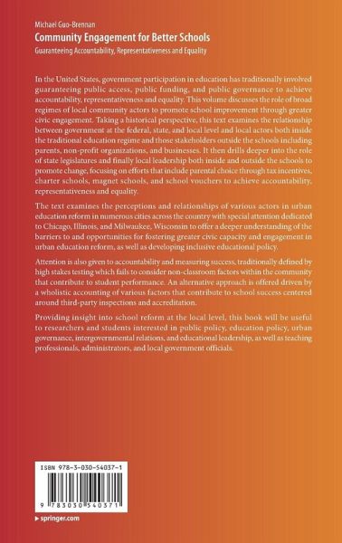 In the United States, government participation in education has traditionally involved guaranteeing public access, public funding, and public governance to achieve accountability, representativeness and equality. This volume discusses the role of broad regimes of local community actors to promote school improvement through greater civic engagement. Taking a historical perspective, this text examines the relationship between government at the federal, state, and local level and local actors both inside the traditional education regime and those stakeholders outside the schools including parents, non-profit organizations, and businesses. It then drills deeper into the role of state legislatures and finally local leadership both inside and outside the schools to promote change, focusing on efforts that include parental choice through tax incentives, charter schools, magnet schools, and school vouchers to achieve accountability, representativeness and equality.