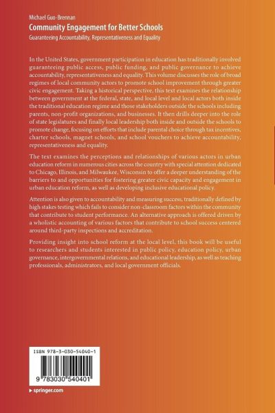 In the United States, government participation in education has traditionally involved guaranteeing public access, public funding, and public governance to achieve accountability, representativeness and equality. This volume discusses the role of broad regimes of local community actors to promote school improvement through greater civic engagement. Taking a historical perspective, this text examines the relationship between government at the federal, state, and local level and local actors both inside the traditional education regime and those stakeholders outside the schools including parents, non-profit organizations, and businesses. It then drills deeper into the role of state legislatures and finally local leadership both inside and outside the schools to promote change, focusing on efforts that include parental choice through tax incentives, charter schools, magnet schools, and school vouchers to achieve accountability, representativeness and equality.