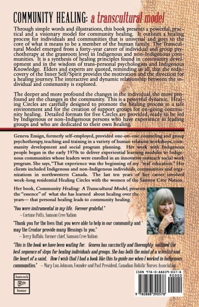 Geneva Ensign is now retired from a 45-year career in the helping profession. Formerly self-employed, her company, Explorations Counselling & Training Services, provided one-to-one counselling and group psychotherapy, teaching and training in a variety of human relations workshops, community development and social program planning. Her work with Indigenous people began in the early 1970s when she signed a contract to design and deliver experiential learning modules to Indigenous communities whose leaders were enrolled in an innovative (for that time) outreach social work program. She says, ?That experience was the beginning of my ?real? education.? She continued to work by contract, learning through each new challenge. Her clients included Indigenous and non-Indigenous individuals, communities and organizations in northwestern Canada: British Columbia, The Yukon, Alberta, Northwest Territories as well as Manitoba and Ottawa. The last ten years of her career involved weeklong residential Healing Circles with the women of the Samson Cree Nation. Her book, Community Healing: A Transcultural Model, presents the ?essence? of what she has learned about healing over the years?that personal healing leads to community healing. Dr. Duane Massing, professor emeritus of social work, Grant MacEwan University, says that Geneva distills her decades of experience and wisdom into a powerful, practical and visional model. It is, through and through, a strength-based book about healing the wounds that beset individuals, families and communities.?
