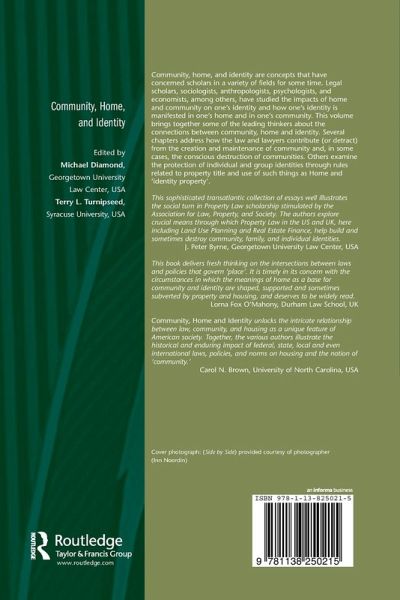 This volume brings together some of the leading thinkers about the connections between community, home and identity. Several chapters address how the law and lawyers contribute (or detract) from the creation and maintenance of community and, in some cases, the conscious destruction of communities. Others examine the protection of individual and group identities through rules related to property title and use of such things as Home and 'identity property'.