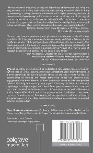 "Researchers have not paid nearly enough attention to the role of identifications in political life. I therefore welcome Community Identity and Political Behavior for its careful examination of the political effects of identification with the community. The results presented in the book are strong and advocate for serious consideration of sense of community as a variable in political analysis. As part of a growing wave of research on identity and political life, the book is very timely." - Peter Muhlberger, Director for the Center for Communication Research and Assistant Research Professor at the College of Mass Communications, Texas Tech University