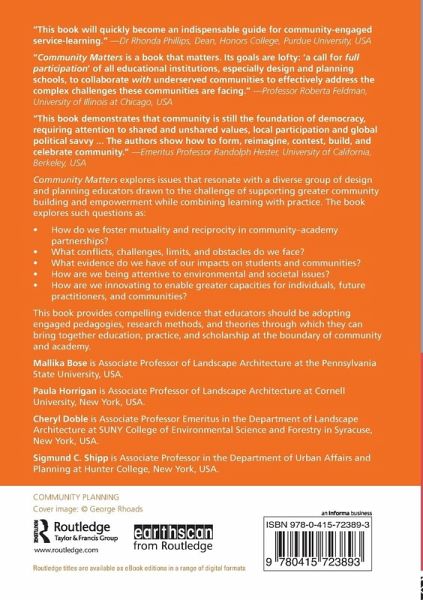 Introduction: Why Community Matters 1. Taking Stock: Perspectives on Community Matters Part 1: Partnering to Advance Productive Community Dialogues 2. Partnering, Because Community Matters 3. Establishing a Place for Common Ground: A Case Study of the Role of a Service-Learning Studio in Neighborhood University Development 4. Spaces of Connection: Implementing the Design of a High-Tech Learning Space for Youth Part 2: Original Seeing: Beholding Community 5. Recalling and Remembering Community: Cell Phone Diaries 6. Considering Public History 7. Finding and Reassembling Community Amidst Disaster Part 3: Co-Imagining Alternative Worlds 8. Clearwater Studio: Co-imagining a Living Past and a Common Future 9. The Politics of Radical Pedagogy: Transforming Power and Seeking Justice 10. Rust to Green: Cultivating Resilience in the Rust Belt Part 4: Changing from Within: Recasting Academic Communities 11. Democracy Matters, Beginning in the Classroom: Towards a Collaborative (Democratic?) Design Studio 12. Changing Racial Attitudes: Community-based Learning and Service in East St. Louis, Illinois 13. Putting Community First: Reflections on History, Identity, and Power in Local and Global Service-Learning Part 5: Outcomes Matter: Creating an Evaluative Community 14. Reaching Out and Reaching In: Investigating Community Impact of a University Outreach Program 15. Probing Impacts: Voices of Community 16. The Semester Ends but the Community Challenges Do Not: A Legacy to Continue the Work in East Harlem 17. Life Before/During/Between/After the Service-learning Design Studios Bibliography