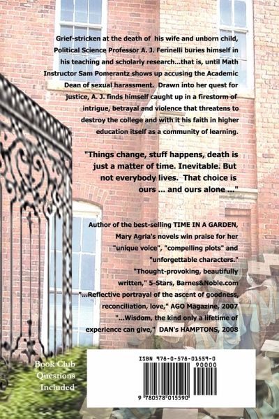 Grief-stricken at the death of his wife and unborn child, Political Science Professor A. J. Ferinelli buries himself in his teaching and scholarly research...that is, until Math Instructor Sam Pomerantz shows up accusing the Academic Dean of sexual harassment. Drawn into her quest for justice, A.J. finds himself caught up in a firestorm of intrigue, betrayal and violence that threatens to destroy the college and with it his faith in higher education itself as a community of learning. "Things change, stuff happens, death is just a matter of time. Inevitable. But not everybody lives. That choice is ours...and ours alone..." "A winner...Agria captures academia with knowledge and sensitivity. Characters show beautiful personal growth."