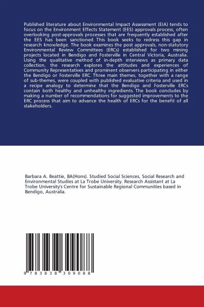 Published literature about Environmental Impact Assessment (EIA) tends to focus on the Environment Effects Statement (EES) approvals process, often overlooking post-approvals processes that are frequently established after the EES has been sanctioned. This book seeks to redress this gap in research knowledge. The book examines the post approvals, non-statutory Environmental Review Committees (ERCs) established for two mining projects located in Bendigo and Fosterville in Central Victoria, Australia. Using the qualitative method of in-depth interviews as primary data collection, the research explores the attitudes and experiences of Community Representatives and prominent observers participating in either the Bendigo or Fosterville ERC. Three main themes, together with a range of sub-themes, were coupled with published evaluative criteria and used in a recipe analogy to determine that the Bendigo and Fosterville ERCs contain both healthy and unhealthy ingredients. The book concludes by making a number of recommendations for suggested improvements to the ERC process that aim to advance the health of ERCs for the benefit of all stakeholders.