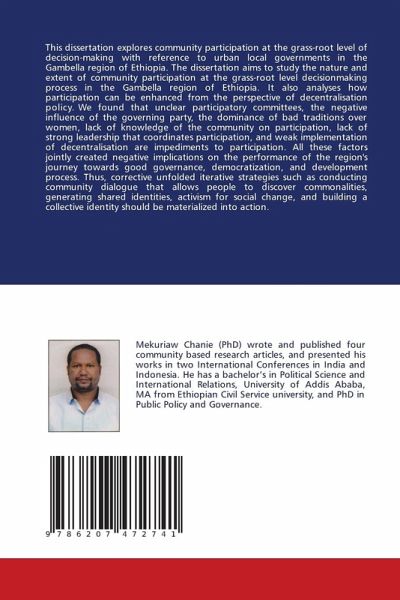 This dissertation explores community participation at the grass-root level of decision-making with reference to urban local governments in the Gambella region of Ethiopia. The dissertation aims to study the nature and extent of community participation at the grass-root level decisionmaking process in the Gambella region of Ethiopia. It also analyses how participation can be enhanced from the perspective of decentralisation policy. We found that unclear participatory committees, the negative influence of the governing party, the dominance of bad traditions over women, lack of knowledge of the community on participation, lack of strong leadership that coordinates participation, and weak implementation of decentralisation are impediments to participation. All these factors jointly created negative implications on the performance of the region's journey towards good governance, democratization, and development process. Thus, corrective unfolded iterative strategies such as conductingcommunity dialogue that allows people to discover commonalities, generating shared identities, activism for social change, and building a collective identity should be materialized into action.