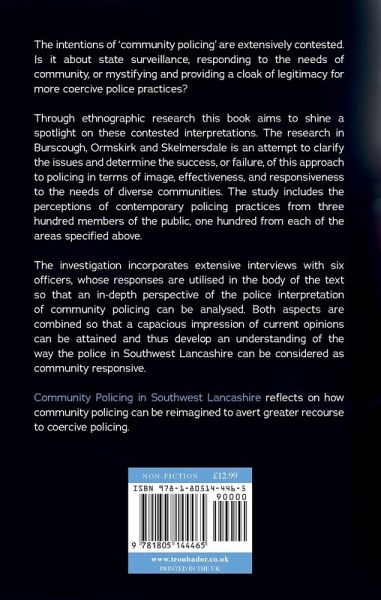 The intentions of 'community policing' are extensively contested. Is it about state surveillance, responding to the needs of community, or mystifying and providing a cloak of legitimacy for more coercive police practices? Through ethnographic research this book aims to shine a spotlight on these contested interpretations. The research in Burscough, Ormskirk and Skelmersdale is an attempt to clarify the issues and determine the success, or failure, of this approach to policing in terms of image, effectiveness, and responsiveness to the needs of diverse communities. The study includes the perceptions of contemporary policing practices from three hundred members of the public, one hundred from each of the areas specified above. The investigation incorporates extensive interviews with six officers, whose responses are utilised in the body of the text so that an in-depth perspective of the police interpretation of community policing can be analysed. Both aspects are combined so that a capacious impression of current opinions can be attained and thus develop an understanding of the way the police in Southwest Lancashire can be considered as community responsive. Community Policing in Southwest Lancashire reflects on how community policing can be reimagined to avert greater recourse to coercive policing.