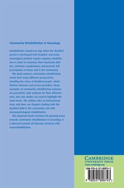Rehabilitation should not stop when the disabled person is discharged from hospital, and many neurological patients require ongoing rehabilitation in order to maximize their functional abilities, minimize complications and promote full participation at home and in the community. This book analyses community rehabilitation needs from many different perspectives, including the views of disabled people, rehabilitation clinicians and service providers. Many examples of community rehabilitation schemes are presented, with evidence for their effectiveness, and case studies are used to highlight the main issues. The authors take an international view, and there are chapters dealing with the disabled child in the community and with neuropsychological rehabilitation. This important book examines the growing trend towards community rehabilitation in neurology and is directed towards all clinicians involved with neurorehabilitation.
