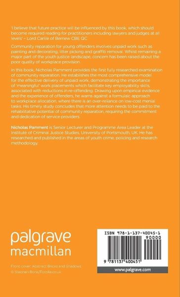 In this book, Nicholas Pamment provides the first fully researched examination of community reparation. He establishes the most comprehensive model for the effective delivery of unpaid work, demonstrating the importance of 'meaningful' work placements which facilitate key employability skills, associated with reductions in re-offending. Drawing upon empirical evidence and the experience of offenders, he warns against a formulaic approach to workplace allocation, where there is an over-reliance on low cost menial tasks. His timely study concludes that more attention needs to be paid to the rehabilitative potential of community reparation, requiring the commitment and dedication of service providers.