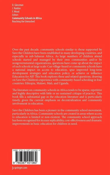 Over the past decade, community schools similar to those supported by Save the Children have been established in many developing countries, and especially in sub-Saharan Africa. As large numbers of children attend schools started and managed by their own communities and/or by nongovernmental organizations, questions have come up about the impact of such schools at large scale: "Can village-based or community schools have a national impact on access to education, spur improved long-term development strategies and education policy, or achieve or influence Education for All? This book explores these and related questions, drawing on Save the Children's experience with community-based schooling in four countries: Ethiopia, Malawi, Mali, and Uganda.