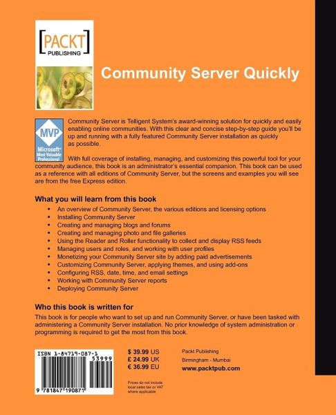 Working with this clear and concise step-by-step guide you'll be up and running with a fully featured Community Server Express Edition website based on ASP.NET as fast as possible. With full coverage of installing, managing, and customizing this powerful tool for your community audience, this book is the essential administrator's companion Community Server is Telligent System's award-winning solution for quickly and easily enabling online communities. It includes a suite of integrated applications, such as blogs, discussion forums, photo sharing, file sharing, email lists, newsgroups, and more, which together can help you create your community presence. Community Server is the trusted solution for many organizations ranging from Microsoft and Dell to Conde Nast and Match.com, and powers massive communities like the Microsoft ASP.NET forums (www.asp.net/forums) and the XBOX forums (forums.xbox.com). You can learn more about Community Server, and see it in action, at http://www.communityserver.org. Written in a clear and concise manner, this book will guide you through the installation, administration, customization, and deployment of a Community Server solution. With the help of this book you will be able to start using your Community Server site within minutes of its installation. The book kicks off with a brief overview of Community Server, its various editions and licensing options, and installation procedures and then delves deep into the creation and management of blogs, forums, photo galleries, file galleries, and more. The book also explores the different ways you can customize your Community Server site along with coverage of various add-ons and modules. You will also learn how to manage your Community Server license and other related settings. Towards the end, the book provides an overview of the various steps required to deploy Community Server to a hosting server. This book targets the free Express Edition of Community Server. The book covers: An overview of Community Server, and the various editions and licensing options Installing Community Server Creating and managing blogs and forums Creating and managing photo and file galleries Using the Reader and Roller functionality to collect and display RSS feeds Managing users and roles, and working with user profiles Monetizing your Community Server site by adding paid advertisements Customizing Community server, applying themes, and using add-ons Configuring RSS, Date, Time, and Email settings Understanding Community Server Reports Deploying Community Server With this book in hand, you will be able to set up and manage a Community Server solution. You will learn how to create blogs, forums, photo galleries, and file galleries, and use tools such as the built-in RSS reader and RSS roller in a step-by-step manner. This book will provide your with a clear and concise overview of Community Server and will impart the knowledge necessary to enable you to run and manage a Community Server solution. Who this book is written for This book is aimed at the Community Server administrator with a base level of technical competence and confidence, but no prior sysadmin or developer experience or knowledge. No knowledge of ASP.NET programming is required for using this book. What is essential is your own passion for your target community and your desire to provide the best platform possible to that audience.