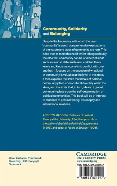 Despite the frequency with which the term 'community' is used, it is hard to find any comprehensive exploration of the nature and value of community. This book tries to remedy this omission whilst taking seriously the idea that community can be of different kinds and can exist at different levels, and that these levels and kinds may come into conflict with one another. It focuses on the question of what kind of community is valuable at the level of the state. It then explores the limits that ideals of political community place upon cultural diversity within the state, and the limits that, in turn, ideals of global community place upon the self-determination of political communities. This book will be of interest to students of political theory, philosophy and international relations.