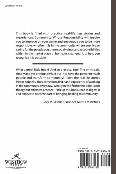 This book is filled with practical real-life true stories and experiences. Community: Whose Responsibility will inspire you to improve on your game and encourage you to be more responsible, whether it is in the community where you live or caring for the people you share social values and responsibilities with-in the market place or home. Its clear goal is to help you recognize it is possible. What a great little book! And so practical too! The principals, simply and yet profoundly laid out in it, have the power to reach people and transform community! I love the real life stories Pastor Bob tells. They come from first hand experience of working in the community every day. What you will find in this book is not theory but effective practice. Pick up this book, read it, digest it and expect to become part of bringing healing to community. -Gary M. Skinner, Founder Watoto Ministries
