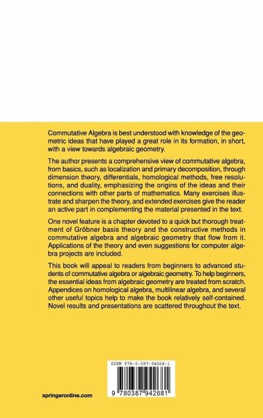 Advice for the Beginner.- Information for the Expert.- Prerequisites.- Sources.- Courses.- Acknowledgements.- 0 Elementary Definitions.- 0.1 Rings and Ideals.- 0.2 Unique Factorization.- 0.3 Modules.- I Basic Constructions.- 1 Roots of Commutative Algebra.- 2 Localization.- 3 Associated Primes and Primary Decomposition.- 4 Integral Dependence and the Nullstellensatz.- 5 Filtrations and the Artin-Rees Lemma.- 6 Flat Families.- 7 Completions and Hensel's Lemma.- II Dimension Theory.- 8 Introduction to Dimension Theory.- 9 Fundamental Definitions of Dimension Theory.- 10 The Principal Ideal Theorem and Systems of Parameters.- 11 Dimension and Codimension One.- 12 Dimension and Hilbert-Samuel Polynomials.- 13 The Dimension of Affine Rings.- 14 Elimination Theory, Generic Freeness, and the Dimension of Fibers.- 15Gröbner Bases.- 16 Modules of Differentials.- III Homological Methods.- 17 Regular Sequences and the Koszul Complex.- 18 Depth, Codimension, and Cohen-Macaulay Rings.- 19 Homological Theory of Regular Local Rings.- 20 Free Resolutions and Fitting Invariants.- 21 Duality, Canonical Modules, and Gorenstein Rings.- Appendix 1 Field Theory.- A1.1 Transcendence Degree.- A1.2 Separability.- A1.3.1 Exercises.- Appendix 2 Multilinear Algebra.- A2.1 Introduction.- A2.2 Tensor Product.- A2.3 Symmetric and Exterior Algebras.- A2.3.1 Bases.- A2.3.2 Exercises.- A2.4 Coalgebra Structures and Divided Powers.- A2.5 Schur Functors.- A2.5.1 Exercises.- A2.6 Complexes Constructed by Multilinear Algebra.- A2.6.1 Strands of the Koszul Comple.- A2.6.2 Exercises.- Appendix 3 Homological Algebra.- A3.1 Introduction.- I: Resolutions and Derived Functors.- A3.2 Free and Projective Modules.- A3.3 Free and Projective Resolutions.- A3.4 Injective Modules and Resolutions.- A3.4.1 Exercises.- Injective Envelopes.- Injective Modules over Noetherian Rings.- A3.5 Basic Constructions with Complexes.- A3.5.1 Notation and Definitions.- A3.6 Maps and Homotopies of Complexes.- A3.7 Exact Sequences ofComplexes.- A3.7.1 Exercises.- A3.8 The Long Exact Sequence in Homology.- A3.8.1 Exercises.- Diagrams and Syzygies.- A3.9 Derived Functors.- A3.9.1 Exercise on Derived Functors.- A3.10 Tor.- A3.10.1 Exercises: Tor.- A3.1l Ext.- A3.11.1 Exercises: Ext.- A3.11.2 Local Cohomology.- II: From Mapping Cones to Spectral Sequences.- A3.12 The Mapping Cone and Double Complexe.- A3.12.1 Exercises: Mapping Cones and Double Complexes.- A3.13 Spectral Sequences.- A3.13.1 Mapping Cones Revisited.- A3.13.2 Exact Couples.- A3.13.3 Filtered Differential Modules and Complexes.- A3.13.4 The Spectral Sequence of a Double Complex.- A3.13.5 Exact Sequence of Terms of Low Degree.- A3.13.6 Exercises on Spectral Sequences.- A3.14 Derived Categories.- A3.14.1 Step One: The Homotopy Category of Complexes.- A3.14.2 Step Two: The Derived Category.- A3.14.3 Exercises on the Derived Category.- Appendix 4 A Sketch of Local Cohomology.- A4.1 Local Cohomology and Global Cohomology.- A4.2 Local Duality.- A4.3 Depth andDimensio.- Appendix 5 Category Theory.- A5.1 Categories, Functors, and Natural Transformations.- A5.2 Adjoint Functors.- A5.2.1 Uniqueness.- A5.2.2 Some Examples.- A5.2.3 Another Characterization of Adjoints.- A5.2.4 Adjoints and Limits.- A5.3 Representable Functors and Yoneda's Lemma.- Appendix 6 Limits and Colimits.- A6.1 Colimits in the Category of Modules.- A6.2 Flat Modules as Colimits of Free Modules.- A6.3 Colimits in the Category of Commutative Algebras.- A6.4 Exercises.- Appendix 7 Where Next?.- References.- Index of Notation.