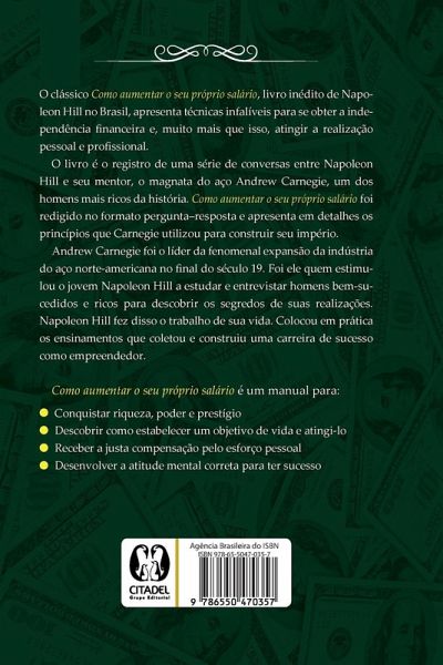 O clássico Como aumentar o seu próprio salário, livro inédito de Napoleon Hill no Brasil, apresenta técnicas infalíveis para se obter a independência financeira e, muito mais que isso, atingir a realização pessoal e profissional. O livro é o registro de uma série de conversas entre Napoleon Hill e seu mentor, o magnata do aço Andrew Carnegie, um dos homens mais ricos da história. Como aumentar o seu próprio salário foi redigido no formato perguntäresposta e apresenta em detalhes os princípios que Carnegie utilizou para construir seu império. Andrew Carnegie foi o líder da fenomenal expansão da indústria do aço norte-americana no final do século 19. Em valores atuais, sua fortuna equivaleria a cerca de US$ 80 bilhões, o que faria dele o homem mais rico do mundo. Foi Carnegie quem estimulou o jovem Napoleon Hill a estudar e entrevistar homens bem-sucedidos e ricos para descobrir os segredos de suas realizações. Napoleon Hill fez disso o trabalho de sua vida. Colocou em prática os ensinamentos que coletou e construiu uma carreira de sucesso como empreendedor. Como aumentar o seu próprio salário é um manual para: - Conquistar riqueza, poder e prestígio - Descobrir como estabelecer um objetivo de vida e atingi-lo - Receber a justa compensação pelo esforço pessoal - Desenvolver a atitude mental correta para ter sucesso