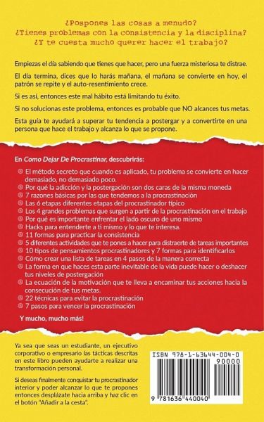 ¿Pospones las cosas a menudo? ¿Tienes problemas con la consistencia y la disciplina? ¿Y te cuesta mucho querer hacer el trabajo? Empiezas el día sabiendo que tienes que hacer, pero una fuerza misteriosa te distrae. El día termina, dices que lo harás mañana, el mañana se convierte en hoy, el patrón se repite y el auto-resentimiento crece. Si es así, entonces este mal hábito está limitando tu éxito. Si no solucionas este problema, entonces es probable que NO alcances tus metas. Esta guía te ayudará a superar tu tendencia a postergar y a convertirte en una persona que hace el trabajo y alcanza lo que se propone. En Como dejar de procrastinar, descubrirás: El método secreto que cuando es aplicado, tu problema se convierte en hacer demasiado, no demasiado poco. Por qué la adicción y la postergación son dos caras de la misma moneda 7 razones básicas por las que tendemos a la procrastinación Las 6 etapas diferentes etapas del procrastinador típico Los 4 grandes problemas que surgen a partir de la procrastinación en el trabajo Por qué es importante enfrentar el lado oscuro de uno mismo 11 formas para practicar la consistencia 5 diferentes actividades que te pones a hacer para distraerte de tareas importantes 10 tipos de pensamientos procrastinadores y 7 formas para identificarlos Cómo crear una lista de tareas en 4 pasos de la manera correcta La ecuación de la motivación que te lleva a encaminar tus acciones hacia la consecución de tus metas. 22 técnicas para evitar la procrastinación 7 pasos para vencer la procrastinación Y mucho, mucho más! Ya sea que seas un estudiante, un ejecutivo corporativo o empresario las tácticas descritas en este libro pueden ayudarte a realizar una transformación personal. Si deseas finalmente conquistar tu procrastinador interior y poder alcanzar lo que te propones entonces desplázate hacia arriba y haz clic en el botón "Añadir a la cesta".