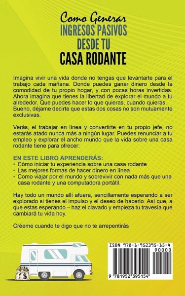 Advertencia: Leer esto puede causar que dejes tu trabajo y persigas la aventura de tus sueños sobre una casa rodante Imagina una vida en la que no tengas que encontrarte en el trabajo todas las mañanas a las 9 de la mañana. Puedes trabajar directamente desde la comodidad de tu propia casa durante las horas que mejor se adapten a tu estilo de vida. ¿Te lo estás imaginando? Maravilloso. Pero espera, hay más... Tienes libertad, la libertad de ir a donde tu corazón desee. Tal vez has tenido un destino de ensueño en tu mente durante años, sólo para aplazarlo hasta el próximo verano cuando esperas tener el tiempo y el dinero para ello. Pero, ¿qué pasaría si te dijera que hay una manera de ir a ese destino de ensueño este año, y que incluso podrías llevar tu trabajo contigo a cualquier lugar donde decidas ir después de eso? Esto no es una escena cinematográfica de Hollywood, sino algo completamente posible para ti. Al trabajar en línea y convertirte en tu propio jefe, ya no tendrás que estar atado a ningún lugar. Puedes dejar tu trabajo y explorar el mundo aventurero que te ofrece la vida en casa rodante. A menudo vemos a personas influyentes en Instagram o YouTube que viajan a tiempo completo y nos hacen pensar: "Vaya, si tan sólo fuera yo. ¡Están viviendo la vida!" Sí, definitivamente lo están. ¡Pero tú también puedes! Todo lo que se necesita para lograr tu sueño es dedicación e impulso, y por supuesto los recursos adecuados a tu lado, cosas que ya no debes seguir buscando. En El Manual Para Ingresos Pasivos Sobre Una Casa Rodante, descubrirás: •Las mejores maneras de obtener un ingreso pasivo, incluyendo qué tipo de ingreso es el más adecuado para ti. •Por qué trabajar en línea y obtener ingresos pasivos es algo que cualquiera puede hacer, y cómo empezar ahora mismo •Los mitos desacreditados sobre los ingresos pasivos que asustan a la gente •Lo más importante que debes tener en cuenta cuando construyas un negocio •Formas alternativas de ganar dinero que no requieren ningún título educativo •La mejor manera de gestionar tus ganancias y ganar aún más dinero •Cómo cambiar tu forma de pensar es la clave del éxito •Muchos recursos adicionales para guiarte aún más en el trabajo en línea que elijas. ¡Y mucho más! Si deseas descubrir los secretos para dejar el trabajo que tienes de 9 a 5 y explorar el mundo en una casa rodante, desplázate hacia arriba y haz clic en el botón "Añadir a la cesta" ahora mismo.