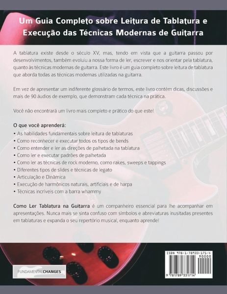 Um Guia Completo sobre Leitura de Tablatura na Guitarra A tablatura existe desde o século XV, mas, tendo em vista que a guitarra passou por desenvolvimentos, também evoluiu a nossa forma de ler, escrever e nos orientar pela tablatura, quanto às técnicas modernas de guitarra. Este livro é um guia completo sobre leitura de tablatura que aborda todas as técnicas modernas utilizadas na guitarra. Em vez de apresentar um indiferente glossário de termos, o livro Como Ler Tablatura na Guitarra contém dicas, discussões e mais de 90 áudios de exemplo, que demonstram cada técnica na prática. Você não encontrará um livro mais completo e prático do que este! O Que Você Aprenderá: ¿ As habilidades fundamentais sobre leitura de tablaturas ¿ Como reconhecer e executar todos os tipos de bends ¿ Como entender e ler as direções de palhetada na tablatura ¿ Como ler e executar padrões de palhetada ¿ Como ler as técnicas de rock moderno, como rakes, sweeps e tappings ¿ Diferentes tipos de slides e técnicas de legato ¿ Articulação e Dinâmica ¿ Execução de harmônicos naturais, artificiais e de harpa ¿ Técnicas incríveis com a barra whammy Bônus: Além de conter capítulos completos dedicados à leitura e execução das técnicas de guitarra acima descritas, o livro Como Ler Tablatura na Guitarra possui uma seção completa sobre as frequentemente confusas direções estruturais na música, como as marcas de repetição, similes, chaves de volta, Da Capo al Fine, codas e muito mais!