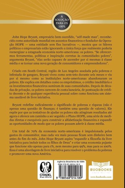 "Criado em South Central, região de Los Angeles assolada pela pobreza e infestada de gangues, Bryant viu por si mesmo como as instituições norte-americanas abandonaram os pobres. Ele explica em detalhes como os empréstimos de negócios, o crédito imobiliário e os investimentos financeiros sumiram de suas comunidades. Depois de décadas de privação, os pobres carecem de conta bancária, de pontuação de crédito decente e de qualquer experiência pessoal sobre como funciona um sistema saudável de livre iniciativa. Bryant redefine radicalmente o significado de pobreza e riqueza (não é apenas uma questão de finanças; é também uma questão de valores). Ele expõe por que as tentativas de ajudar os pobres não atingiram resultados até agora e oferece um caminho a ser seguido: o Plano HOPE, uma série de medidas diretas e exequíveis para construir o letramento financeiro e expandir as oportunidades, de modo que os pobres possam aderir à classe média. Um total de 70% da economia norte-americana é impulsionada pelos gastos do consumidor, mas cada vez mais pessoas ficam sem dinheiro bem antes do fim do mês. John Hope Bryant aspira ¿expandir a filosofia da livre iniciativa para incluir todos os filhos de Deus¿ e criar uma economia pujante que funcione não apenas para 1%, nem mesmo para 99%, mas para os 100%. Essa é uma abordagem de livre iniciativa para resolver o problema da pobreza e promover uma nova América."