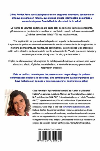 Cómo Perder Peso con Autohipnosis es un programa innovador, basado en un enfoque de sanación natural, que detiene el ciclo interminable de pérdida y aumento de peso. Devolviéndote el control de tu salud. La fuerza de voluntad pertenece a la parte débil de la mente: la mente consciente. ¿Cuántas veces has intentado cambiar un mal hábito usando la fuerza de voluntad? ¿Cuántas veces has fallado? Tal vez muchas veces. Y la explicación es que no has trabajado con la parte de la mente adecuada. La parte más poderosa de nuestra mente es la mente subconsciente: la imaginación, la memoria permanente, los hábitos, los sentimientos, las emociones y las creencias, están todos alojados en la parte de la mente subconsciente. Y es la que debes trabajar y entrenar para hacer el mejor uso de ella, que te obedezca. El plan de alimentación y el programa de autohipnosis funcionan al unísono para lograr el máximo efecto. Optimiza tu metabolismo a través de técnicas y posturas de respiración efectivas. Este es un libro no solo para las personas con mayor riesgo de padecer enfermedades debido a la obesidad, sino también para cualquier persona que haya luchado con su peso y quiera recuperar el control de su salud.