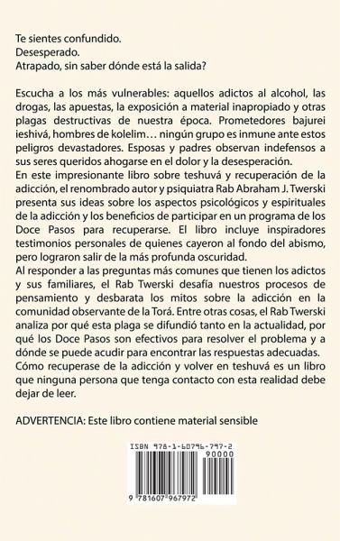 Te sientes confundido. Desesperado. Atrapado, sin saber dónde está la salida.? Escucha a los más vulnerables: aquellos adictos al alcohol, las drogas, las apuestas, la exposición a material inapropiado y otras plagas destructivas de nuestra época. Prometedores bajurei ieshivá, hombres de kolelim… ningún grupo es inmune ante estos peligros devastadores. Esposas y padres observan indefensos a sus seres queridos ahogarse en el dolor y la desesperación. En este impresionante libro sobre teshuvá y recuperación de la adicción, el renombrado autor y psiquiatra Rab Abraham J. Twerski presenta sus ideas sobre los aspectos psicológicos y espirituales de la adicción y los beneficios de participar en un programa de los Doce Pasos para recuperarse. El libro incluye inspiradores testimonios personales de quienes cayeron al fondo del abismo, pero lograron salir de la más profunda oscuridad. Al responder a las preguntas más comunes que tienen los adictos y sus familiares, el Rab Twerski desafía nuestros procesos de pensamiento y desbarata los mitos sobre la adicción en la comunidad observante de la Torá. Entre otras cosas, el Rab Twerski analiza por qué esta plaga se difundió tanto en la actualidad, por qué los Doce Pasos son efectivos para resolver el problema y a dónde se puede acudir para encontrar las respuestas adecuadas. Cómo recuperase de la adicción y volver en teshuvá es un libro que ninguna persona que tenga contacto con esta realidad debe dejar de leer. ADVERTENCIA: Este libro contiene material sensible