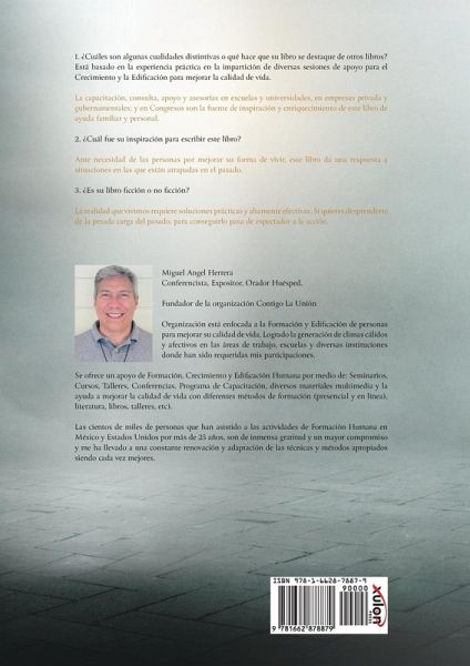 1. ¿Cuáles son algunas cualidades distintivas o qué hace que su libro se destaque de otros libros? Está basado en la experiencia práctica en la impartición de diversas sesiones de apoyo para el Crecimiento y la Edificación para mejorar la calidad de vida. La capacitación, consulta, apoyo y asesorías en escuelas y universidades, en empresas privada y gubernamentales; y en Congresos son la fuente de inspiración y enriquecimiento de este libro de ayuda familiar y personal. 2. ¿Cuál fue su inspiración para escribir este libro? Ante necesidad de las personas por mejorar su forma de vivir, este libro da una respuesta a situaciones en las que están atrapadas en el pasado. 3. ¿Es su libro ficción o no ficción? La realidad que vivimos requiere soluciones prácticas y altamente efectivas. Si quieres desprenderte de la pesada carga del pasado, para conseguirlo pasa de espectador a la acción. Miguel Angel Herrera Conferencista, Expositor, Orador Huésped, Fundador de la organización Contigo La Unión Organización está enfocada a la Formación y Edificación de personas para mejorar su calidad de vida. Logrado la generación de climas cálidos y afectivos en las áreas de trabajo, escuelas y diversas instituciones donde han sido requeridas mis participaciones. Se ofrece un apoyo de Formación, Crecimiento y Edificación Humana por medio de: Seminarios, Cursos, Talleres, Conferencias, Programa de Capacitación, diversos materiales multimedia y la ayuda a mejorar la calidad de vida con diferentes métodos de formación (presencial y en línea), literatura, libros, talleres, etc). Las cientos de miles de personas que han asistido a las actividades de Formación Humana en México y Estados Unidos por más de 25 años, son de inmensa gratitud y un mayor compromiso y me ha llevado a una constante renovación y adaptación de las técnicas y métodos apropiados siendo cada vez mejores.