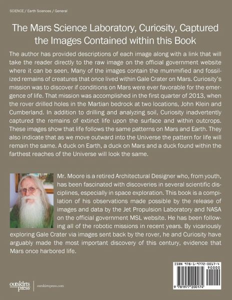 The author has provided descriptions of each image along with a link that will take the reader directly to the raw image on the official government website where it can be seen. Many of the images contain the mummified and fossilized remains of creatures that once lived within Gale Crater on Mars. Curiosity's mission was to discover if conditions on Mars were ever favorable for the emergence of life. That mission was accomplished in the first quarter of 2013, when the rover drilled holes in the Martian bedrock at two locations, John Klein and Cumberland. In addition to drilling and analyzing soil, Curiosity inadvertently captured the remains of extinct life upon the surface and within outcrops. These images show that life follows the same patterns on Mars and Earth. They also indicate that as we move outward into the Universe the pattern for life will remain the same. A duck on Earth, a duck on Mars and a duck found within the farthest reaches of the Universe will look the same.