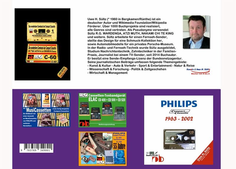 Dieses Buch zeigt auf über 370 Seiten ausgewählte Compact Cassetten ab 1963 von A bis Z. Ebenso ist der Kalender für das Jahr 2063 abgebildet, wenn die Compact Cassette 100 Jahre alt wird. Uwe H. Sültz war mitverantwortlich für das Comeback der Compact Cassette! Was die Presse sagte: "Die Compact Cassette und den Recorder dazu gab es ab 1963. Auf der Funkausstellung in Berlin wurde der welterste PHILIPS EL 3300, sowie die Compact Cassette EL 1903, vorgestellt. Heinz Sültz, Radio- und Fernsehtechniker Meister, Service für SABA, PHILIPS und ELAC, war dabei. Der Entwickler war Lou Ottens. Johannes Jozeph Martinus Schoenmakers und Peter van der Sluis waren mit im Entwicklungsteam. Viele Jahre später versprach Uwe H. Sültz, Autor und Journalist, Lou Ottens, dass die Compact Cassette nie in Vergessenheit geraten würde. Und tatsächlich veröffentlichte Uwe H. Sültz weltweit Bücher über die Compact Cassette und hält so die gesamte Geschichte über Lou Ottens und seiner Erfindung am Leben. Auch die Namen Johannes Jozeph Martinus Schoenmakers und Peter van der Sluis und deren Beitrag zur Cassette und zum Tonkopf bleiben so in Erinnerung und werden nicht vergessen."