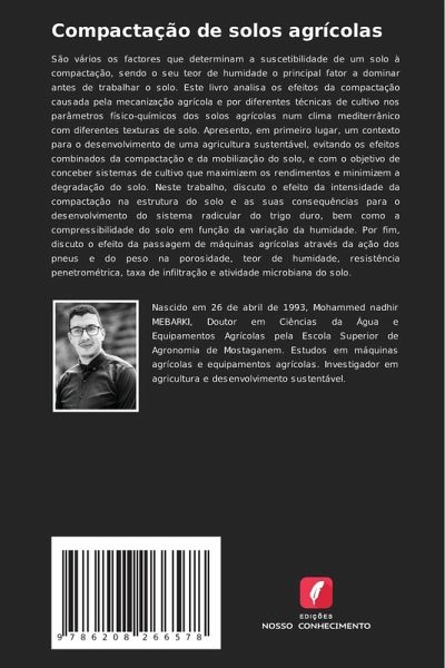 São vários os factores que determinam a suscetibilidade de um solo à compactação, sendo o seu teor de humidade o principal fator a dominar antes de trabalhar o solo. Este livro analisa os efeitos da compactação causada pela mecanização agrícola e por diferentes técnicas de cultivo nos parâmetros físico-químicos dos solos agrícolas num clima mediterrânico com diferentes texturas de solo. Apresento, em primeiro lugar, um contexto para o desenvolvimento de uma agricultura sustentável, evitando os efeitos combinados da compactação e da mobilização do solo, e com o objetivo de conceber sistemas de cultivo que maximizem os rendimentos e minimizem a degradação do solo. Neste trabalho, discuto o efeito da intensidade da compactação na estrutura do solo e as suas consequências para o desenvolvimento do sistema radicular do trigo duro, bem como a compressibilidade do solo em função da variação da humidade. Por fim, discuto o efeito da passagem de máquinas agrícolas através da ação dos pneus e do peso na porosidade, teor de humidade, resistência penetrométrica, taxa de infiltração e atividade microbiana do solo.