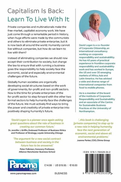 Capitalism Is Back: Learn To Live With It Private companies and multinationals make the free-market, capitalist economy work. We have just come through a remarkable period in history, when huge efforts were made by the communists and others to eliminate private enterprise, but it is now back all around the world. Humanity cannot live without companies, but how do we learn to live with them? Instead of eliminating companies we should now accept their contribution to society, but change the law to ensure that with running a business goes the responsibility to help society face the economic, social and especially environmental challenges of the future. Globally human societies are organically developing social structures based on the work of governments, for-profit and non-profit sectors. Now is the time for private enterprises of the for-profit sector to step forward with the other two formal sectors to help humanity face the challenges of the future. We must actively find ways to bring the power and creativity of private enterprise into positively shaping humanity's future.
