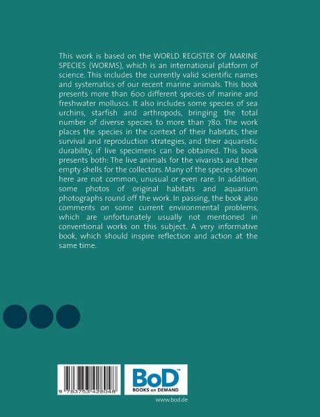 This work is based on the World Register Of Marine Species (Worms), which is an international platform of science. This includes the currently valid scientific names and systematics of our recent marine animals. This book presents more than 600 different species of marine and freshwater molluscs. It also includes some species of sea urchins, starfish and arthropods, bringing the total number of diverse species to more than 780. The work places the species in the context of their habitats, their survival and reproduction strategies, and their aquaristic durability, if live specimens can be obtained. This book presents both: The live animals for the vivarists and their empty shells for the collectors. Many of the species shown here are not common, unusual or even rare. In addition, some photos of original habitats and aquarium photographs round off the work. In passing, the book also comments on some current environmental problems, which are unfortunately usually not mentioned in conventional works on this subject. A very informative book, which should inspire reflection and action at the same time.