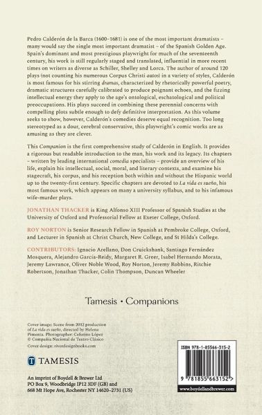 Pedro Calderón de la Barca (1600-1681) is one of the most important dramatists - many would say the single most important dramatist - of the Spanish Golden Age. Spain's dominant and most prestigious playwright for much of the seventeenth century, his work is still regularly staged and translated, influential in more recent times on writers as diverse as Schiller, Shelley and Lorca. The author of around 120 plays (not counting his numerous Corpus Christi autos) in a variety of styles, Calderón is most famous for his stirring dramas, characterized by rhetorically powerful poetry, dramatic structures carefully calibrated to produce poignant echoes, and the fizzing intellectual energy they apply to the age's ontological, eschatological and political preoccupations. His plays succeed in combining these perennial concerns with compelling plots subtle enough to defy definitive interpretation. As this volume seeks to show, however, Calderón's comedies deserve equal recognition. Too long stereotyped as a dour, cerebral conservative, this playwright's comic works are as amusing as they are clever. This Companion is the first comprehensive study of Calderón in English. It provides a rigorous but readable introduction to the man, his work and its legacy. Its chapters - written by leading international comedia specialists - provide an overview of his life, explain his intellectual, social, moral, and literary contexts, and examine his stagecraft, his corpus, and his reception both within and without the Hispanic world up to the twenty-first century. Specific chapters are devoted to La vida es sueño, his most famous work, which appears on many a university syllabus, and to his infamous wife-murder plays.
