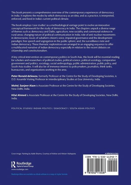 This book presents a comprehensive overview of the contemporary experiences of democracy in India. It explores the modes by which democracy as an idea, and as a practice, is interpreted, enforced, and lived in India's current political climate. The book employs 'case studies' as a methodological vantage point to evolve an innovative conceptual framework for the study of democracy in India. The chapters unpack a diverse range of themes such as democracy and Dalits; agriculture, new sociality and communal violence in rural areas; changing nature of political communication in India; role of anti-nuclear movements in democracies; issues of subaltern citizen's voice, impaired governance and the development paradigm; free speech and segregation in the public sphere; and, the surveillance state and Indian democracy. These thematic explorations are arranged in an engaging sequence to offer a multifaceted narrative of Indian democracy especially in relation to the recent debates on citizenship and constitutionalism. A key critical intervention on contemporary politics in South Asia, this book will be essential reading for scholars and researchers of political studies, political science, political sociology, comparative government and politics, sociology, social anthropology, public administration, public policy, and South Asia studies. It will also be of immense interest to policymakers, journalists, think tanks, bureaucrats, and organizations working in the area.