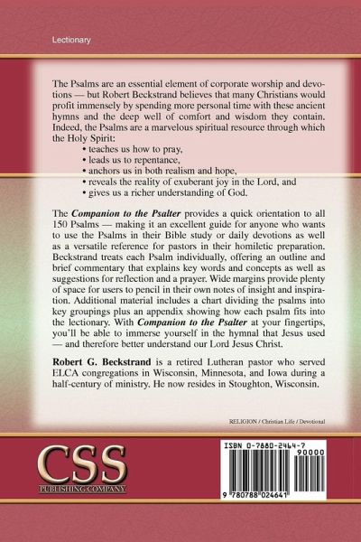 Companion to the Psalter by Robert G. Beckstrand is a biblical theme book and devotional reading book to the Psalms. Here are some of the topics covered in this devotional reading guide: - A Brief Introduction and Devotional Guide to the Psalms - Devotional guide - Devotional reading - Commentaires on the book of Psalms - Book of Psalms - Biblical themes The Psalms are an essential element of corporate worship and devotional life -- but Robert Beckstrand believes that many Christians would profit immensely by spending more time with these ancient hymns and the deep well of comfort and wisdom they contain. Indeed, the Psalms are a marvelous spiritual resource through which the Holy Spirit * teaches us how to pray, * leads us to repentance, * anchors us in both realism and hope, * reveals the reality of exuberant joy in the Lord, and * gives us a richer understanding of God. The Companion to the Psalter provides a quick orientation to all 150 Psalms -- making it an excellent guide for anyone who wants to use the Psalms in their Bible study or daily devotions as well as a versatile reference for pastors in their homiletic preparation. Beckstrand treats each Psalm individually, offering an outline and brief commentary that explains key words and concepts as well as suggestions for reflection and a prayer. Additional material includes a chart dividing the psalms into key groupings plus an appendix showing how each psalm fits into the lectionary. With Companion to the Psalter at your fingertips, you'll be able to immerse yourself in the hymnal that Jesus used -- and therefore better understand our Lord Jesus Christ. Robert G. Beckstrand is a retired Lutheran pastor who served ELCA congregations in Wisconsin, Minnesota, and Iowa during a half-century of ministry. He now resides in Stoughton, Wisconsin. Companion to the Psalter is a biblical theme book and devotional reading book and devotional reading guide to the Psalms.