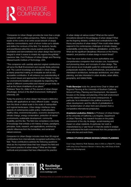 Today the practice of urban design has forged a distinctive identity with applications at many different scales - ranging from the block or street scale to the scale of metropolitan and regional landscapes. Urban design interfaces many aspects of contemporary public policy - multiculturalism, healthy cities, environmental justice, economic development, climate change, energy conservations, protection of natural environments, sustainable development, community liveability, and the like. The field now comprises a core body of knowledge that enfolds a right history of ideas, paradigms, principles, tools, research and applications, enriched by electric influences from the humanities, and social and natural sciences. Companion to Urban Design includes more than fifty original contributions from internationally recognized authorities in the field. These contributions address the following questions: What are the important ideas that have shaped the field and the current practice of urban design? What are the major methods and processes that have influenced the practice of urban design at various scales? What are the current innovations relevant to the pedagogy of urban design? What are the lingering debates, conflicts ad contradictions in the theory and practice of urban design? How could urban design respond to the contemporary challenges of climate change, sustainability, active living initiatives, globalization, and the like? What are the significant disciplinary influences on the theory, research and practice of urban design in recent times? There has never before been a more authoritative and comprehensive companion that includes core, foundational and pioneering ideas and concepts of urban design. This book serves as an invaluable guide for undergraduate and postgraduate students, future professionals, and practitioners interested in architecture, landscape architecture, and urban planning, but also in urban studies, urban affairs, geography, and related fields.