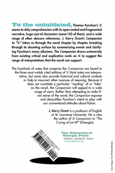 To the uninitiated, Thomas Pynchon's V. seems to defy comprehension with its open-ended and fragmented narrative, huge cast of characters (some 150 of them), and wide range of often obscure references. J. Kerry Grant's Companion to "V". takes us through the novel chapter by chapter, breaking through its daunting surface by summarizing events and clarifying Pynchon's many allusions. The Companion draws extensively from existing critical and explicative work on V. to suggest the range of interpretations that the novel can support. The hundreds of notes that comprise the Companion are keyed to the three most widely cited editions of V. Most notes are interpretive, but some also provide historical and cultural contexts or help to resurrect other nuances of meaning. Because it does not constitute a particular "reading" of, or "take" on, the novel, the Companion will appeal to a wide range of users. Rather than attempting to make final sense of the novel, the Companion exposes and demystifies Pynchon's intent to play with our conventional attitudes about fiction.