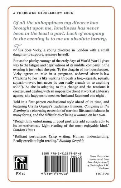 Of all the unhappiness my divorce has brought upon me, loneliness has never been in the least a part. Lack of company in the evening is to me an absolute luxury. Thus does Vicky, a young divorcée in London with a small daughter to support, reassure herself. But as the plucky courage of the early days of World War II gives way to the fatigue and deprivations of its middle, company in the evening is just what she gets. To the chagrin of her housekeeper, Vicky agrees to take in a pregnant, widowed sister-in-law ("Talking to her is like walking through a bog—squash, squash, squash—never, just never do you really crunch on to anything solid"). As she is adapting to this change and the tensions it creates, and dealing with an impossible client at work at a literary agency, she happens to meet ex-husband Raymond one night … Told in a first-person confessional style ahead of its time, and featuring Ursula Orange’s trademark humour, Company in the Evening is a charming evocation of wartime life, snobbishness in many forms, and the difficulties of being a woman on her own. "Delightfully entertaining … good portraits add considerably to its attractiveness. Light reading of the most enjoyable kind." Sunday Times "Brilliant portraiture. Crisp writing. Human understanding. Really excellent light reading." Sunday Graphic